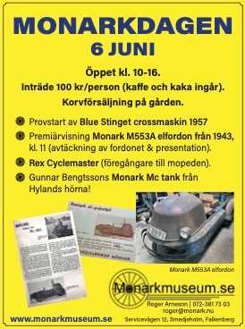 Prisutdelare är Mhrf och tidningen Nostalgia samt representant från Falkenbergs kommun Monarkmuseet har öppet denna dag 18 augusti kl 14-17 och visar allt Monark tillverkat under 111 år